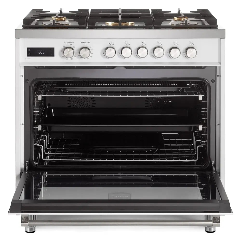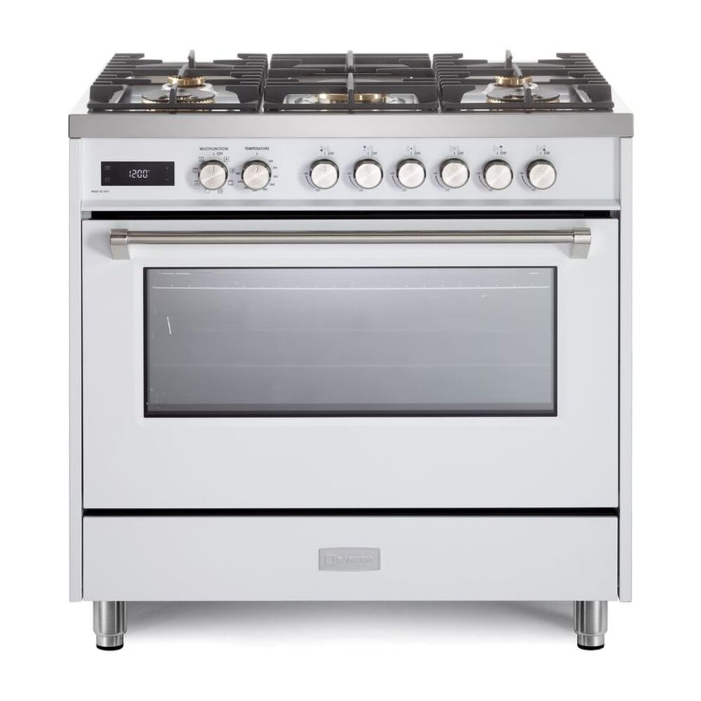 Verona VUFSGE365W 36 inch Ultima Collection Freestanding Dual Fuel Range with 5 Sealed SABAF Brass Burners, 5 cu. ft. Oven Capacity (White)