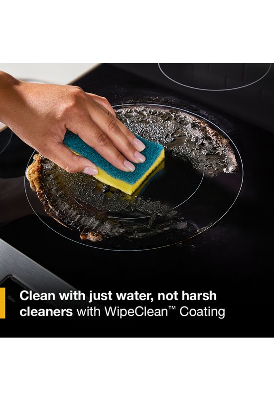 WipeClean™ Coating offers the ultimate easy-clean solution for electric cooktops*. Water alone removes baked-on food and spills; no harsh cleaners required. Simply wet, wait, and wipe with a non-scratch sponge.